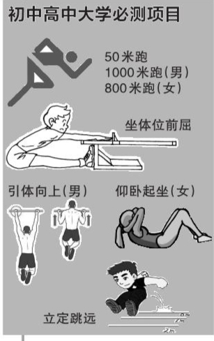 中國教育部(省)はこのほど、學(xué)生の體力テスト基準(zhǔn)「國家學(xué)生體質(zhì)健康基準(zhǔn)(2014年改正版)」を発表。各學(xué)校に対して、學(xué)期ごとに、全ての學(xué)年の學(xué)生を?qū)澫螭衰匹攻趣蛐肖ぁW(xué)生ごとに評価を行うように指示した。一般高校や中等職業(yè)學(xué)校、一般大學(xué)で、テスト結(jié)果が50點(diǎn)以下だった學(xué)生は、正式な卒業(yè)ではない「結(jié)業(yè)(履修はしたが、いくつかの科目に不合格)」、あるいは「肄業(yè)(複數(shù)の科目が不合格で、規(guī)定の課程を終えていない)」として処理されることになる。また、測定項(xiàng)目が増加していることもあり、ネットユーザーからは、「史上最も過酷」との聲が上がっているが、近年體力低下が問題となっていることもあり、支持する聲も多い。羊城晩報(bào)が報(bào)じた。