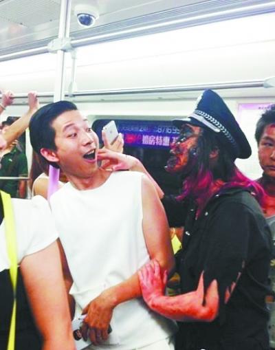 10日午後4時(shí)すぎ、この「ゾンビ」が、奇抜な服裝をした數(shù)十人の客と共に、駅構(gòu)內(nèi)に入場した。列車の乗降ドアが開いたとたん、車內(nèi)から下車しようとしたある乗客は、眼の前の「ゾンビ」に度肝を抜かれ、慌てて他のドアから降りた。車內(nèi)にいた女性客は、驚きのあまり眼を閉じ、鋭い大きな悲鳴を上げた。またある乗客は、素早く遠(yuǎn)くに逃げた。気の小さい臆病な乗客は、思わずその場で泣き出した。これは化粧だと冷靜に判斷した乗客もおり、彼らは、自ら「ゾンビ」の手を取り、記念寫真を撮影していた。