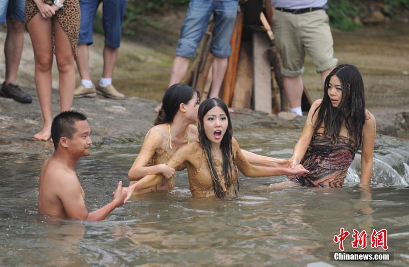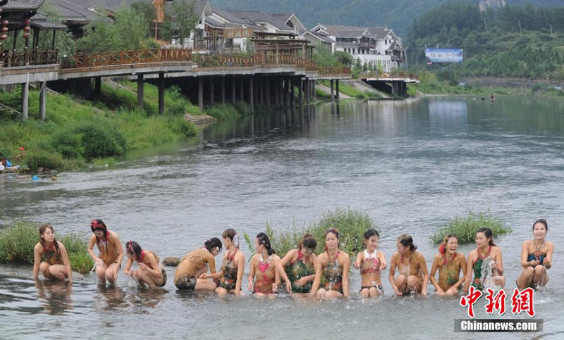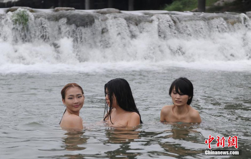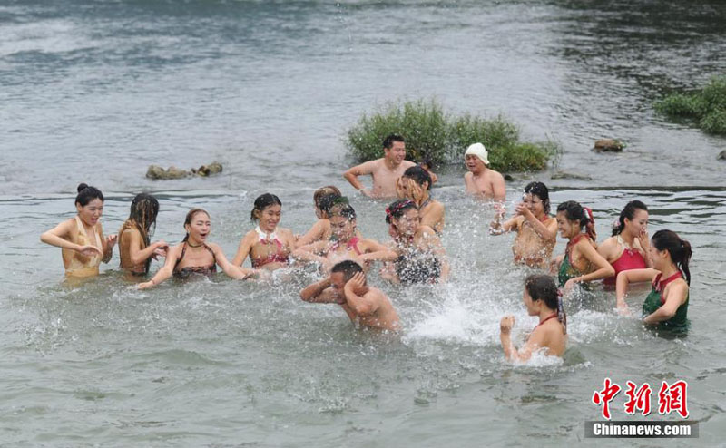 湖南省張家界溪布老街河畔では10日、多くの土家族(トゥチャ族)の若い女性たちが水溫が冷たい川に入って「天沐浴」を行い、今年の農(nóng)作物の豊作を祈願した。中國新聞網(wǎng)が伝えた。(編集YH)