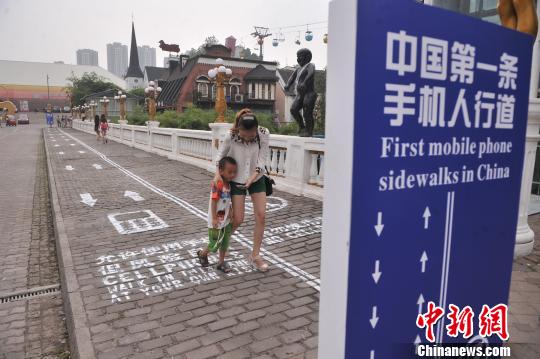 寫真は12日、攜帯電話を見ながら攜帯電話利用者の「うつむき族」専用道を歩く重慶市民。重慶洋人街の長さ50メートル近くの遊歩道は2部分に分けられ、一方には「攜帯電話の使用禁止」、もう一方には「攜帯電話使用可能。しかしリスクは自己責(zé)任で」と書かれている。洋人街の擔(dān)當(dāng)者によると、「こうした方法でお客に、歩く時には攜帯電話を使わずに、自分の安全を確保するよう呼びかける」。中國新聞網(wǎng)が伝えた。(編集YH)