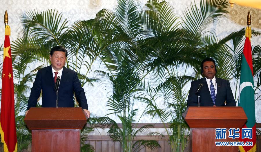 習(xí)主席は「雙方はハイレベル相互訪問を継続し、各分野の交流?協(xié)力を拡大する必要がある。モルディブ側(cè)と海洋経済、海上安全保障、海洋科學(xué)研究?環(huán)境保護(hù)、災(zāi)害防止?コントロール分野の協(xié)力を強(qiáng)化し、経済貿(mào)易協(xié)力合同委員會制度を通じて、二國間貿(mào)易?投資についてしっかりと計畫を立て、インフラ整備?民生分野の協(xié)力を重點(diǎn)的に推進(jìn)したい。中國側(cè)はモルディブ側(cè)の打ち出したマレ―フルレ橋プロジェクトを積極的に研究、支持し、モルディブ側(cè)の経済発展計畫などへの中國企業(yè)の參加、モルディブ観光サービス業(yè)への投資を支持し、さらに多くの中國國民にモルディブ観光を奨勵する。モルディブ側(cè)が効果的な措置を講じて中國人観光客の安全と合法的権益をしっかりと保障することを希望する。中國側(cè)は気候変動対策、持続可能な発展におけるモルディブなど小島嶼國の懸念を理解しており、南南協(xié)力の枠組みでモルディブ側(cè)に物資援助を行い、人的資源育成、省エネ?環(huán)境保護(hù)技術(shù)分野で協(xié)力を展開するとともに、気候変動問題國際交渉での調(diào)整や協(xié)調(diào)を強(qiáng)化し、共通だが差異ある責(zé)任の原則に基づく包括的で均衡ある結(jié)果が出るよう會議を促し、途上國の権益を共同で守る」と表明した。