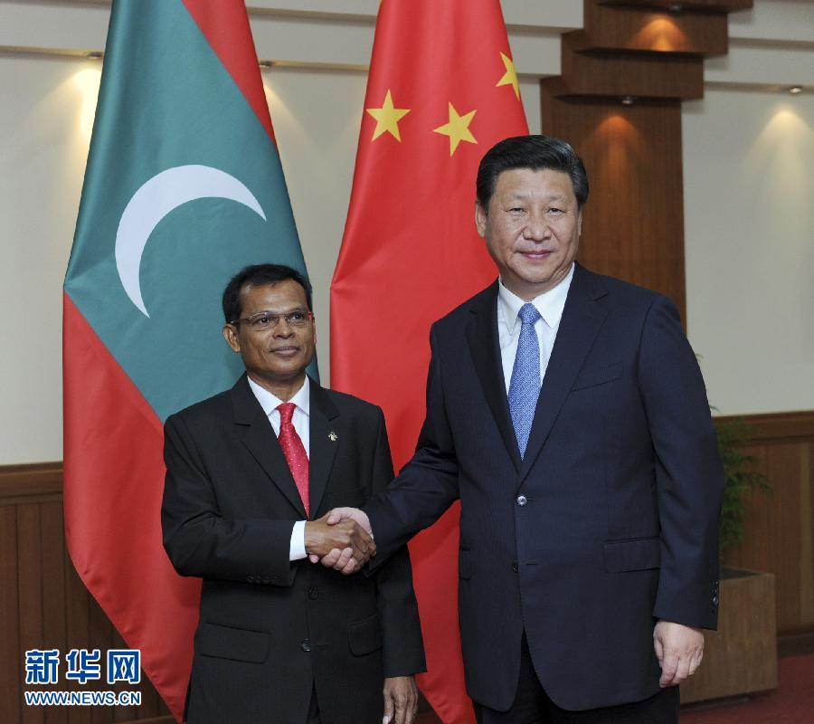 Abdulla Maseeh Mohamed國(guó)民議會(huì)議長(zhǎng)との會(huì)談で習(xí)主席は「中國(guó)はモルディブ経済?社會(huì)の発展を支持する。本日午前、私とヤーミン大統(tǒng)領(lǐng)は未來志向の包括的友好協(xié)力パートナーシップを構(gòu)築し、経済?貿(mào)易、観光、インフラ整備、海洋分野の協(xié)力を拡大し、手を攜えて21世紀(jì)の海のシルクロードを共同建設(shè)する考えで一致した。両國(guó)の立法機(jī)関が往來を強(qiáng)化し、両國(guó)関係の推進(jìn)に積極的役割を発揮することを希望する」と表明した。