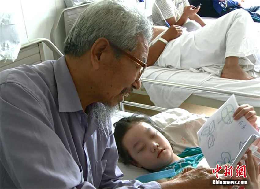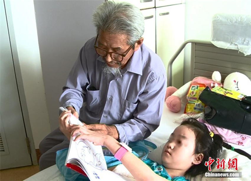 河北省醫(yī)科大學(xué)第3醫(yī)院で15日、交通事故で足を切斷した涵ちゃんにお話を聞かせる84歳の蘇福林さん。寄付の他にも、蘇さんは色鉛筆などの文具を彼女のために購入している。蘇福林さんは河北省石家荘に住むごく普通の退職した労働者だが、高等教育を受けた経験のない彼は24年にわたり、毎月基本的な生活費(fèi)を手元に殘した後は、殘りの年金を全て支援が必要な人に寄付している。合計(jì)いくら寄付したのか、誰を支援したのか、蘇さん自身も全て覚えてはいないという。中國新聞網(wǎng)が伝えた。(編集YH)