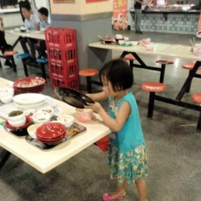 6歳の女の子が父親を手伝って食堂の食器の後片付け (2)