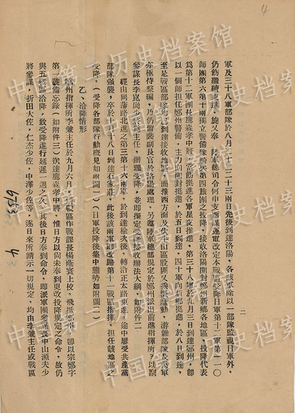 第21部の説明によると、洛陽區(qū)の投降受け入れは、第一戦區(qū)の胡宗南司令長(zhǎng)官の指揮の下に行われ、鄭州?開封?新郷の投降が受け入れられた。同區(qū)の日本投降代表は、中國(guó)侵略日本軍第12軍の鷹森孝司令官が務(wù)めた。日本軍の投降部隊(duì)のうち第110師団は洛陽、第6騎兵団と第22軍は新郷、第10獨(dú)立騎兵団は鄭州に集中していた。1945年9月22日、胡宗南は鄭州で鷹森孝の投降を受け入れた。