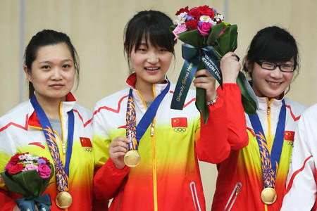 | 女子10メートルエアピストルでダブル金メダル。左から郭文◆、周慶媛、張夢(mèng)円の各選手。 |