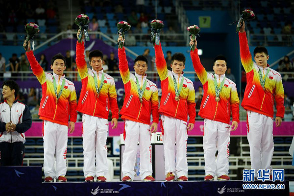 寫真は21日、授賞式で観客に謝意を表する中國の鄒凱、黃玉國、黃熙、楊勝超、廖俊林、王鵬(左から右)の各選手。同日行われた2014年インチョンアジア大會の體操男子団體戦で、中國チームは350.300ポイントの成績で銅メダルに輝いた。新華網(wǎng)が伝えた。(編集YH)