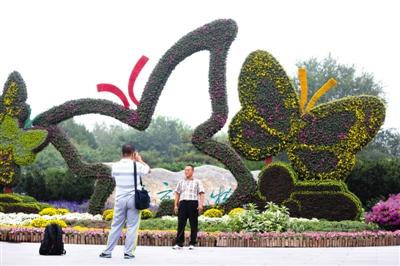 | 22日、北京植物園で、菊の花で作られた「蝶」の前で撮影する來園者 |