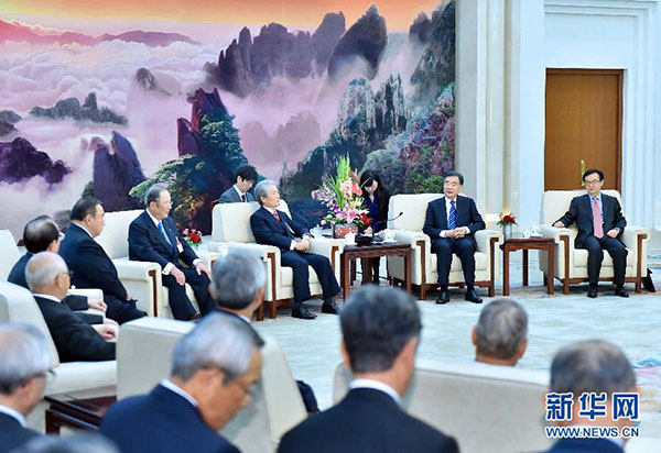 汪洋副総理は24日午後、張富士夫氏を団長、榊原定征氏を最高顧問とする日本の日中経済協(xié)會訪中団と人民大會堂で會見した。(編集NA)