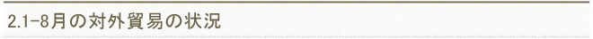 今年1-8月の輸出入額は17兆元で同0.6%増加し、輸出は9兆1千億元で同2.1%の増加、輸入は7兆9千億元で同1.1%の減少だった。貿(mào)易収支は1兆2千億元の黒字で同28.7%増加した。