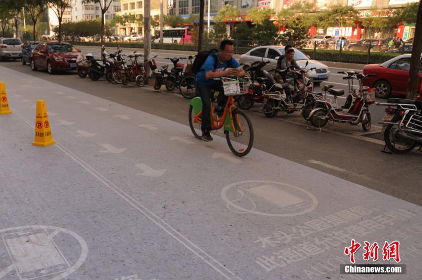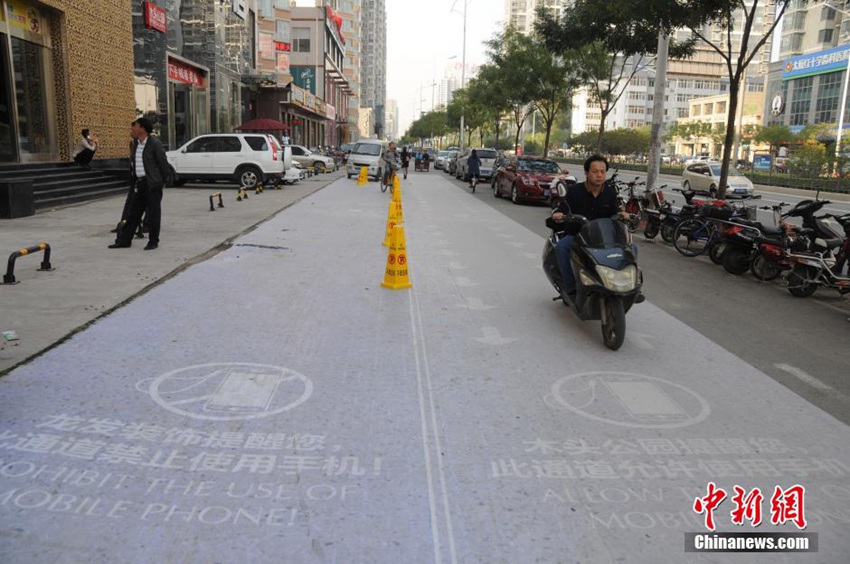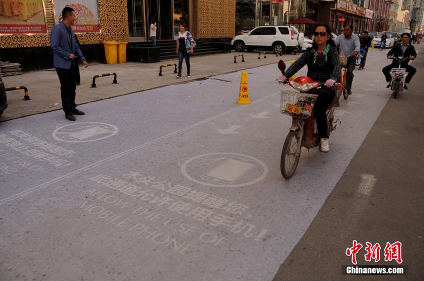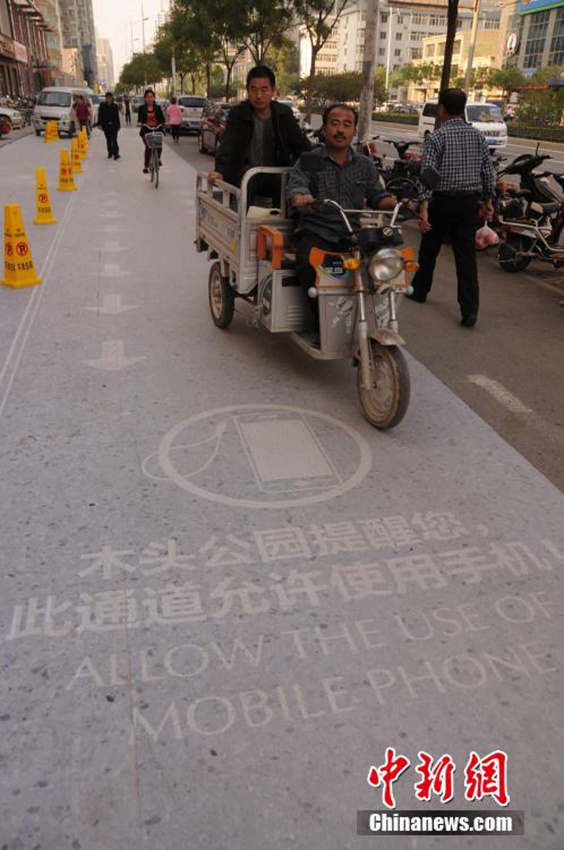 寫真は山西省太原で24日、「攜帯電話利用者歩道」前を歩く人。この「攜帯電話利用者歩道」は長さ約50メートルで、付近の商業(yè)施設(shè)がペイントして作ったものだ。自転車道の半分を占めているため、「攜帯電話利用者歩道」には車の流れが絶えない。多くの市民がこの歩道に興味を示して寫真を撮影している。市民の中には自転車道で「攜帯電話の使用を許可する」のは大変危険で、デパートの宣伝行為だと見ている人もいる。中國新聞網(wǎng)が伝えた。(編集YH)