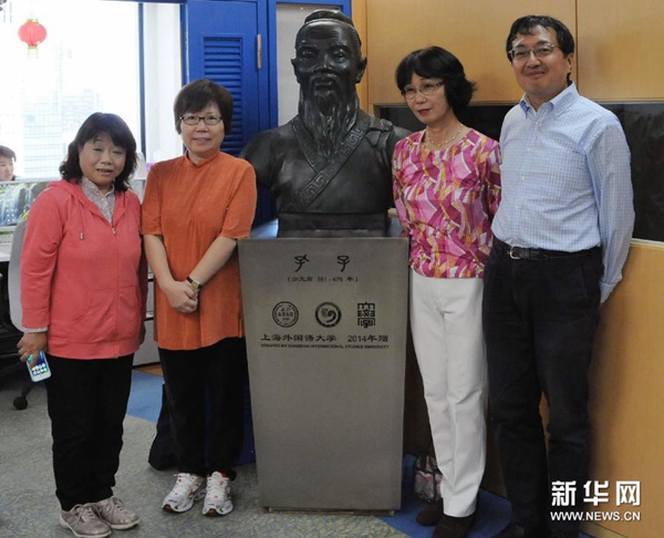 | 日本?大阪産業(yè)大學(xué)の孔子學(xué)院で27日、孔子像と記念撮影する日本人學(xué)生。 |
