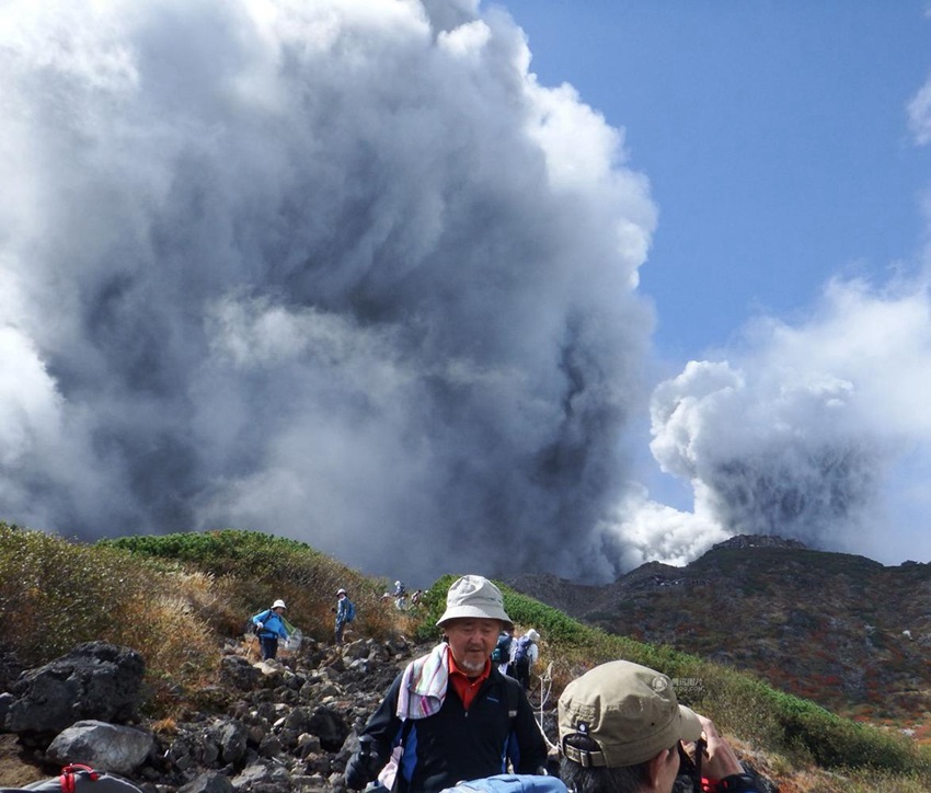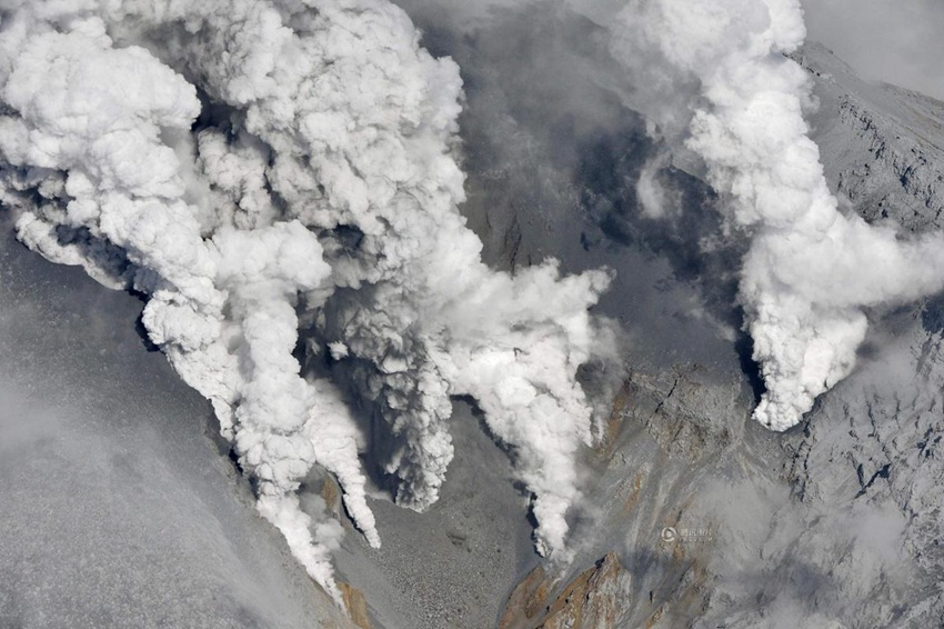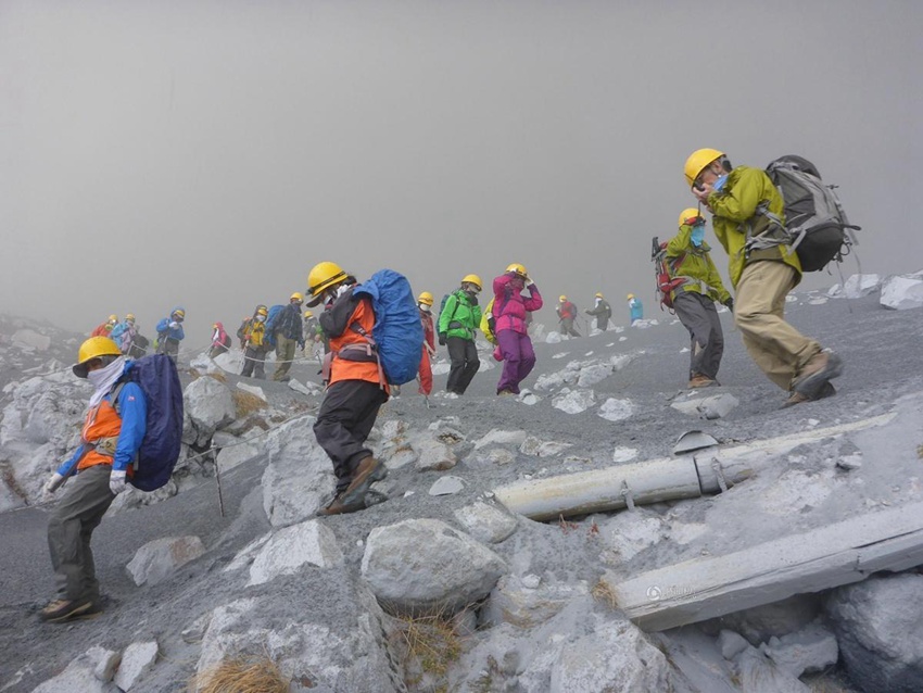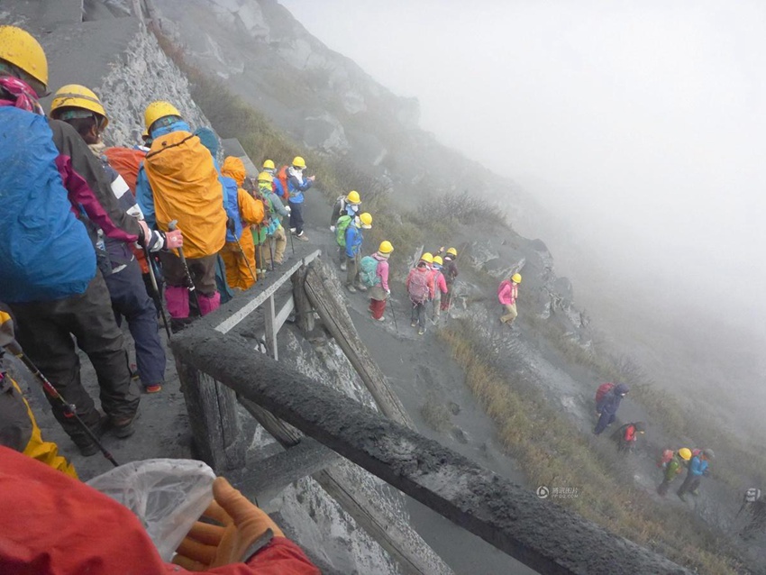 日本中部の火山、御嶽山が27日晝に突然噴火した。登山シーズンにあたっていたため、登山客數(shù)百人が山上に取り殘され、30人以上が重軽傷を負(fù)ったと伝えられている。寫真は火山の噴火に遭遇し、火山灰の中で下山して避難する長野県と岐阜県の登山客。中青網(wǎng)が伝えた。(編集YH)