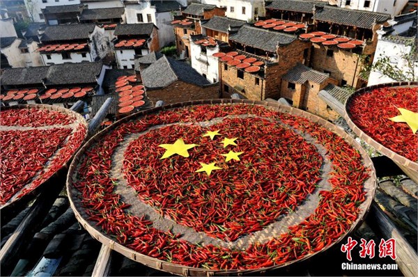 中國のおばさん、國慶節(jié)を祝うため「唐辛子」製國旗を作成 (2)