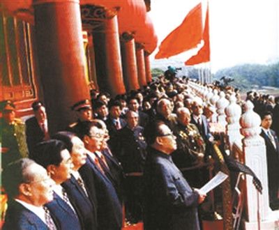 1999年10月1日、天安門樓閣上で講話を発表する江沢民氏。