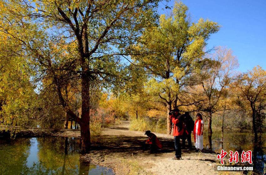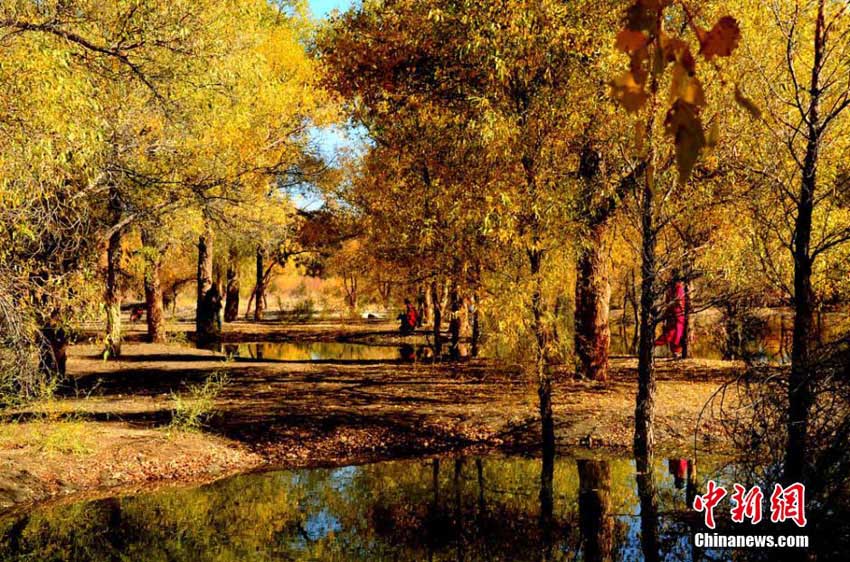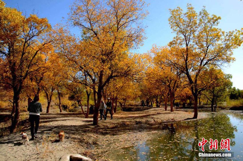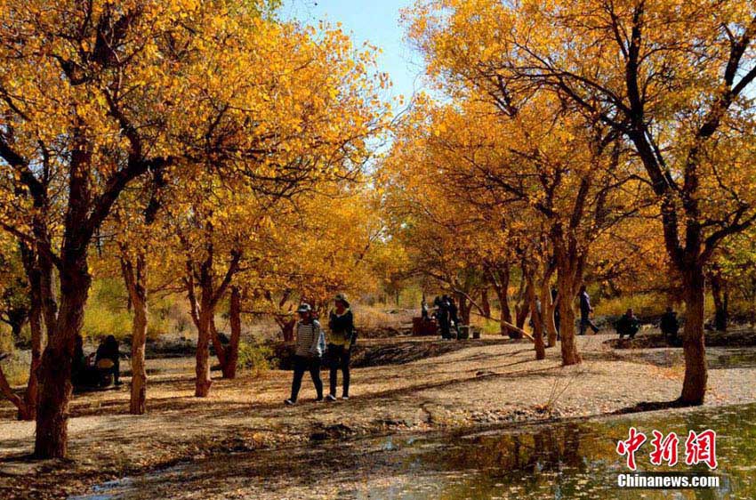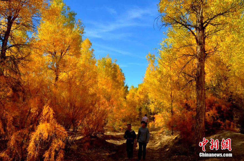 甘粛省金塔森林公園は現(xiàn)在、胡楊林によって絵のように美しく彩られている。黃金色の葉の一枚一枚、樹齢を重ねた幹、青い空、秋の胡楊林が互いに照り映えて、ことのほか壯観な美しさを呈している。金塔県胡楊林周辺には北西の特色ある様々な樹木が8萬ムーにわたり生えている。中國新聞網(wǎng)が伝えた。(編集NA)