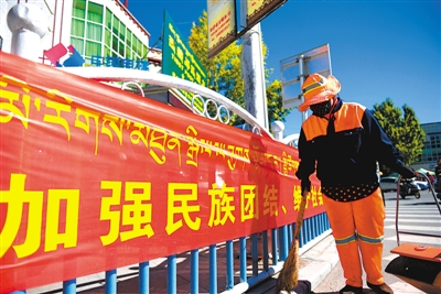 10月5日、西蔵(チベット)自治區(qū)ラサ市の路上を清掃する職員。國慶節(jié)連休中もラサでは市民生活へのサービスが途絶えないよう、多くの人々が持ち場を堅守している。