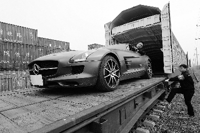| 國內(nèi)初のマイカー輸送列車で旅を終え、北京大紅門駅に到著したベンツ。係員が列車から車を降ろしている。 |