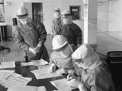 真剣な面持ちで問診記録を記載する、シエラレオネ―中國友好病院エボラ院內(nèi)観察センター醫(yī)療看護チームのスタッフ