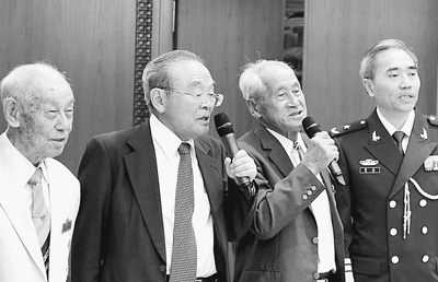 | 2012年7月29日、在日中國大使館で開催された、中國人民解放軍設(shè)立85周年を祝うパーティーで、「中國人民解放軍軍歌」を歌う筒井重雄氏ら。左から右にそれぞれ小林寛澄氏、水野正昭氏、筒井氏、在日中國大使館武官の徐斌少將。 |