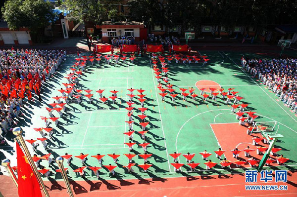 寫真は13日、活動で赤いネッカチーフで「65」の字を形作る北京市東城區(qū)和平里第4小學校の児童。北京市東城區(qū)和平里第4小學校では同日、教師と児童が「社會主義の核心的価値観を?qū)g踐し、赤いネッカチーフで中國の夢とつながる」というテーマの活動を?qū)g施し、隊旗の知識學習や入隊式といった活動を通じて中國少年先鋒隊の設(shè)立65周年を記念した。新華網(wǎng)が伝えた。(編集YH)