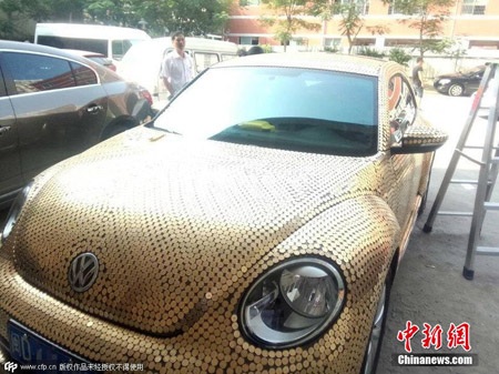福建省廈門(アモイ)市に13日、5角(0.5元、約9円)硬貨で裝飾した「土豪金」(土豪<金遣いが荒く品のない金持ち>が好む金色)の乗用車が登場した。中國新聞網(wǎng)が伝えた。(編集YH)