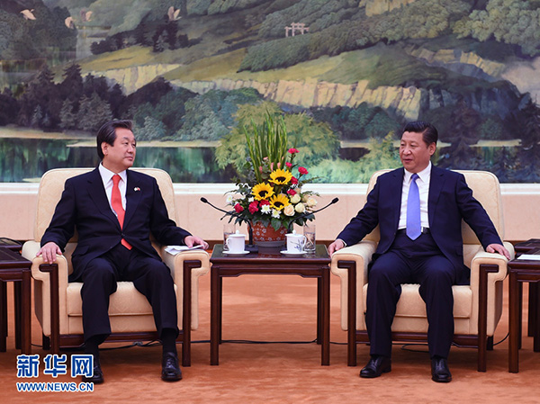 習(xí)近平中共中央総書記(國家主席)は14日、中韓政黨政策対話の初會合のため訪中した韓國セヌリ黨の金武星黨首と人民大會堂で會談した。