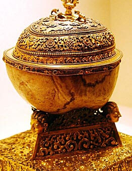 ガバラ碗は金?銀?銅などの金屬によって包まれる。ガバラ碗には美しい図案が施され、観賞の価値が高く希少価値が高い。今回発見されたガバラ碗は銀を下地とし金の彫刻が施されており、蓋?碗?受け皿に分かれている?;鹧驻涡韦颏筏可wのつまみには寶石がはめられ、4本の枝の模様がつまみを囲んでいる。蓋にはさらに縁起の良い「輪、螺、傘、蓋、花、罐、魚、長」の字が刻まれている。(編集YF)