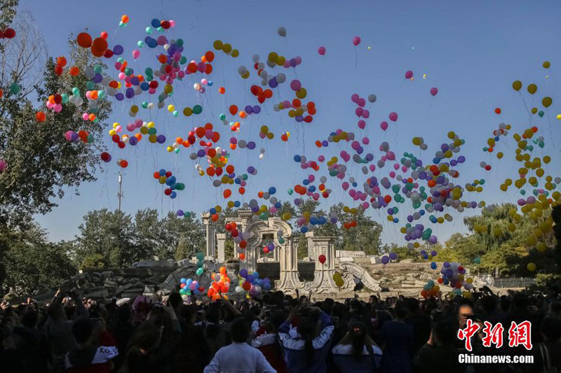 寫真は16日、成人式で記念撮影する學生たち。円明園大水法前では同日、北京101中學(中高一貫校)の學生600人が成人式を行った。海淀區(qū)教育委員會、円明園管理処、101中學の管理者や教師、保護者が活動に參加した。中國新聞網(wǎng)が伝えた。(編集YH)