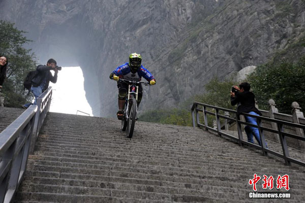 寫真は15日、湖南省張家界天門山で代表的な観光ポイントの天門洞の999段の「天の階段」に挑戦する臺(tái)灣地區(qū)出身の有名サイクリストの江思翰氏。江思翰氏は同日自転車で999段の「天の階段」を駆け下りた。わずか10數(shù)秒の高速での走行に、周囲の観光客はあいた口がふさがらなかった。中國(guó)新聞網(wǎng)が伝えた。(編集YH)