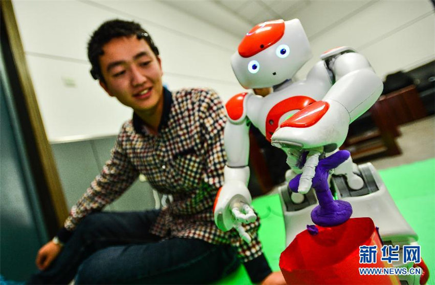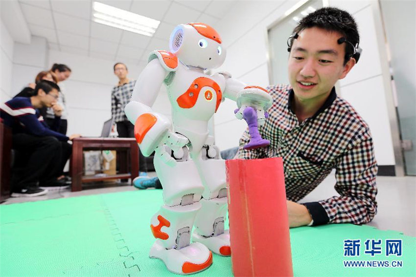 天津の南開大學(xué)で20日、脳により制御するロボットが公開された。同ロボットは、同校のコンピュータ?制御工學(xué)學(xué)院の5人の大學(xué)生によって共同開発された。頭に取り付けたセンサが人の脳波をキャッチし、その意図をコンピュータで分析し、ロボットに動作の指令を出すことで、脳によりロボットを制御できる。実生活において、このシステムは近代的な家庭生活、家族のいない高齢者や障害者の生活の利便性を高めることができる。寫真は20日、頭にセンサを取り付け、脳波によってロボットを操り、物を動かす実験者。新華社が伝えた。(編集YF)