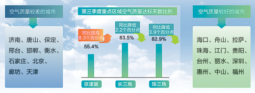 中國環(huán)境保護部(省)は21日、9月と第3四半期(7-9月)の北京、天津、河北省、長江デルタ、珠江デルタ、直轄市、省都、計畫単列市(深セン、寧波市 、青島市、大連市、アモイ)など、74都市の大気質(zhì)狀況を発表した。昨年同時期と比べると、「大気汚染防止行動計畫」など、関連の対策が実施されているほか、気象條件が良かったこともあり、74都市の大気の質(zhì)は改善傾向にある。