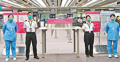 香港の空港で健康カードへの記入を求めるデスク。