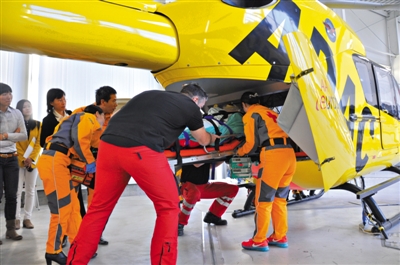 ドイツ救援チームのスタッフと共同で模擬訓(xùn)練を行う999航空醫(yī)療救援チーム。中國初の航空救援醫(yī)療用ヘリの運(yùn)用が、來週28日から始まる。
