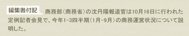同部のモニタリング対象である重點(diǎn)小売企業(yè)500社の1~9月の売上高は前年同期比6.3%増加した。特徴として、▽消費(fèi)市場(chǎng)はインターネットを介した小売の伸びが速かった、▽小規(guī)模?零細(xì)企業(yè)の販売が好調(diào)に伸びた、▽情報(bào)製品やサービス消費(fèi)の伸びが安定していた、▽文化や観光関連の消費(fèi)が引き続き伸びた、などが挙げられる。