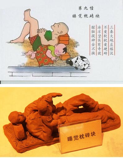 陝西の夏は暑く、寢苦しい夜には農(nóng)家の男たちはレンガか石を枕に寢る。地元の人々はこれを金にも代えられない大切な睡眠法だと冗談めく。陝西の人々の石枕に対する思い入れの深さが窺える。陝西の人々は後頭部が平らな人が比較的多いといわれるが、これは先祖代々石枕で寢ていることに関係があるという説もある。(編集IM)