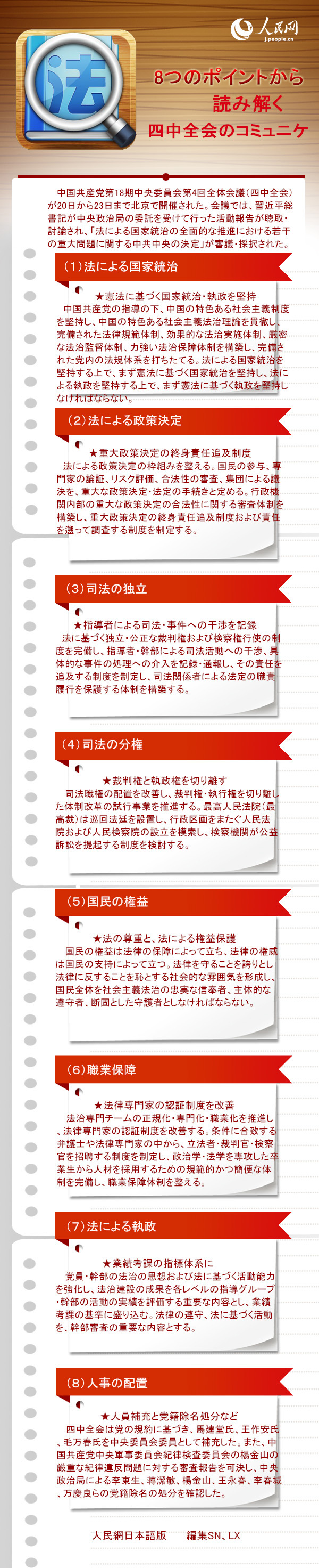 中國共産黨第18期中央委員會第4回全體會議(四中全會)が20日から23日まで北京で開催された。會議では、習近平総書記が中央政治局の委託を受けて行った活動報告が聴取?討論され、「法による國家統(tǒng)治の全面的な推進における若干の重大問題に関する中共中央の決定」が審議?採択された。ここでは、四中全會のコミュニケを8つのポイントから以下のように読み解く。(編集SN、LX)