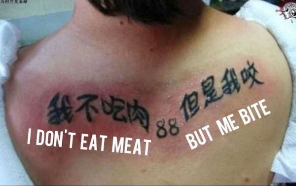 「我不吃肉、但是我咬」(肉は食べないが、噛み付きます)