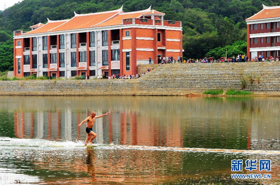 寫(xiě)真は26日、「軽功」(中國(guó)武術(shù)において體を軽くするカンフーの技)を披露する泉州少林寺の武僧?釈理亮氏。泉州少林寺の武僧?釈理亮氏は同日、福建省泉州市區(qū)の草邦ダムで「軽功」の「水上漂」を披露した。2回練習(xí)した後で、氏はメディアと見(jiàn)學(xué)者の見(jiàn)守る中、ベニヤ板の助けを借りて足先で素早く水上を118メートル移動(dòng)するのに成功し、これまでの自分の100メートルという記録を更新した。釈理亮氏は「水上漂」の秘訣について「スピードを速く、歩幅を小さくして、ベニヤ板の浮力を利用して水上を移動(dòng)し、つま先だけに力を入れる」と語(yǔ)る。釈理亮氏は2005年からこの技を練習(xí)し始め、最初はござに木の板を貼ったものを使っていたが、後に軽くて薄いベニヤ板に変えた。新華社が伝えた。(編集YH)