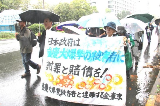 10月22日、日本の行政機関の庁舎が建ち並んでいる東京霞が関に、雨の中傘をさしてミニデモを行う、日本人十數(shù)人の姿があった?!钢貞c大爆撃の被害者と連帯する會」のメンバーだ?!溉毡菊现貞c大爆撃の被害者に賠償と謝罪を!」と書かれた橫斷幕を持って行進するデモ參加者の靴は雨でずぶぬれになっていた。