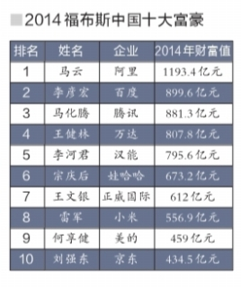 米経済誌「フォーブス」中國版は28日、中國長者番付を発表した。上位3位にはBAT(百度、アリババ<阿里巴巴>、騰訊<テンセント>)の三大富豪が並び、米國での上場をこのほど成功させたアリババの馬雲(yún)氏が資産195億ドル(1ドルは約108円)で首位に立った。「北京晩報」が伝えた。