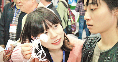 | 3Dプリンター展示ブースで興味津津の來場者。 |