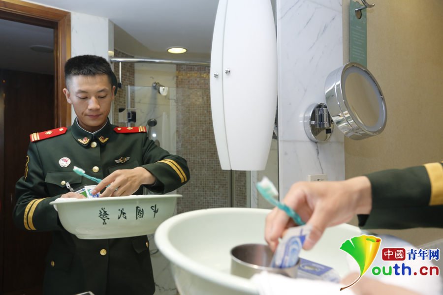 武裝警察將兵の宿泊場所となる客室は5つ星ホテルの標(biāo)準(zhǔn)的な部屋ではあるものの、任務(wù)執(zhí)行の便宜上、2つのベッドを寄せて3人で利用するようにされていた。洗面器やタオルといった日用品を持參し、睡眠時に使う寢具もキャンプから持參していた。ホテル備え付けの使い切りの洗面用具などは洗面臺の上にきちんと置かれたままだった。