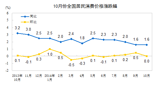 中國(guó)國(guó)家統(tǒng)計(jì)局が10日発表したデータによると、10月の消費(fèi)者物価指數(shù)(CPI)は前年同期比1.6%上昇した。內(nèi)訳は都市部が1.7%、農(nóng)村部が1.4%上昇。食品価格が2.5%上昇、非食品価格が1.2%上昇。消費(fèi)財(cái)価格が1.4%上昇、サービス価格が2.0%上昇。1-10月のCPIは前年同期比2.1%上昇。