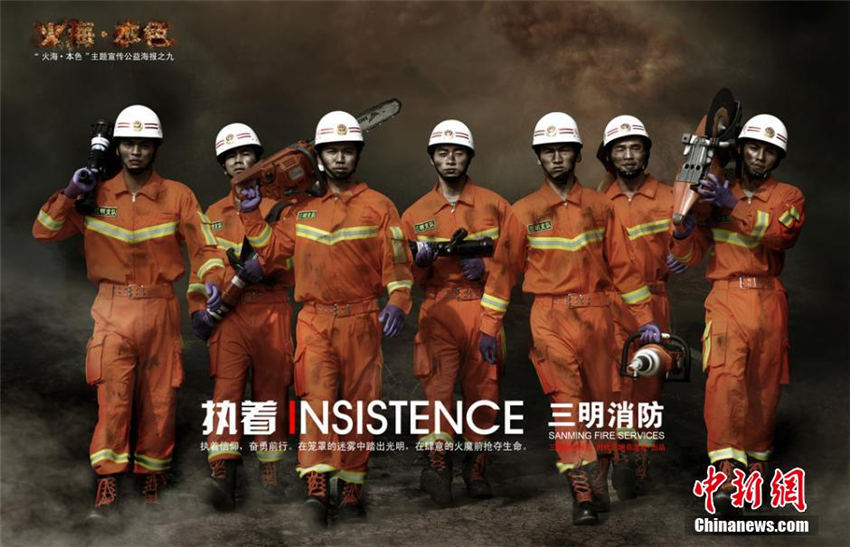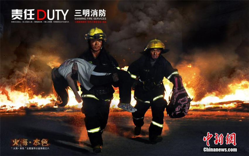 9日の「消防PRデー」を控えた7日、福建省三明市公安消防分隊のPRポスター「火の海?本領(lǐng)発揮!」がお目見えした。ハリウッド大作映畫さながらのポスターからは、「熱血漢」で男気に溢れた三明消防隊員の「プラスのエネルギー」が伝わってくる。ポスターの消防隊員らは、彼らの戦闘服である消防服を身にまとい、日ごろの救援活動で使っている救出用破壊ツールや救援用の縄などの道具を手にしている。火事場をめがけて突進(jìn)する、事故現(xiàn)場に駆けつける、業(yè)務(wù)訓(xùn)練などのシーンは、彼らが、命がけで火事場に臨む姿や真剣なトレーニングの様子が十分に伝えられ、消防隊が24時間いつ何時でも出動命令を待ち、災(zāi)害がどこで発生しようとも現(xiàn)場に駆けつけ、家の安全をしっかりと守るイメージが存分に反映されている。中國新聞網(wǎng)が伝えた。