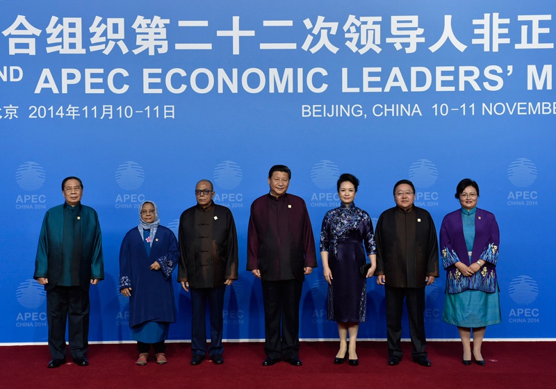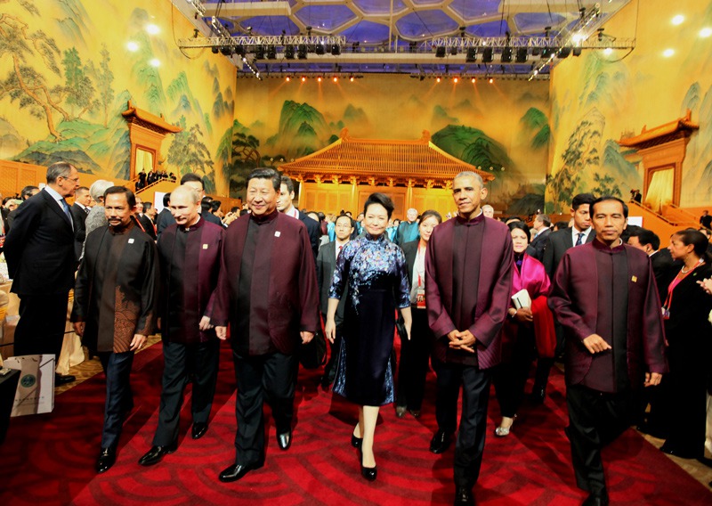 習(xí)主席は式辭で、中國政府と中國國民を代表して貴賓各位を熱烈に歓迎。中國式服裝をまとった各エコノミー首脳らに中國の庶民も隣人や友人のように親しみを感じるだろうと述べた。