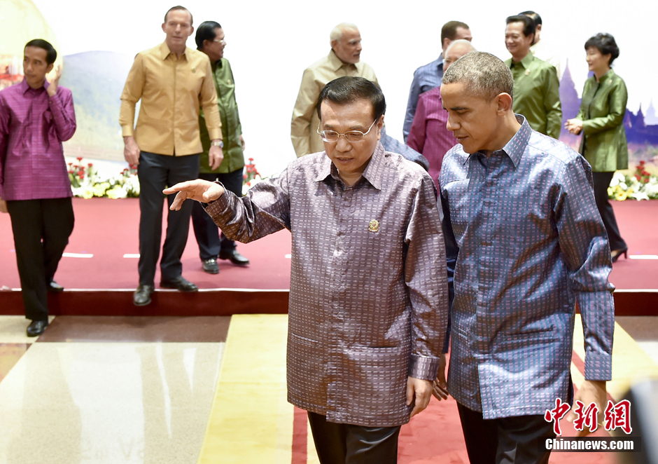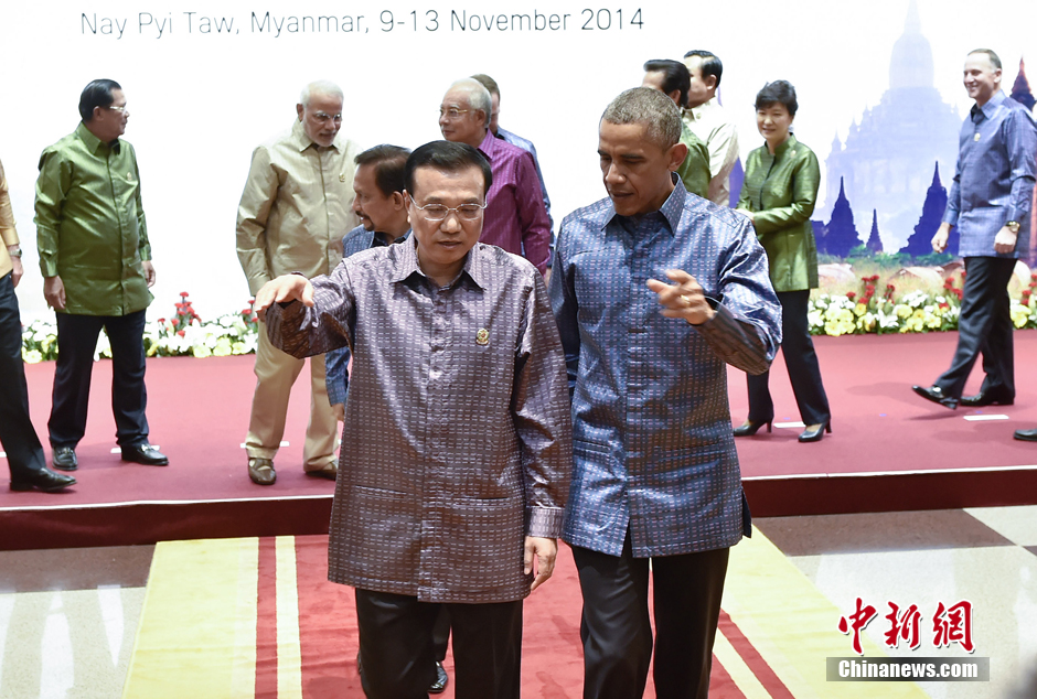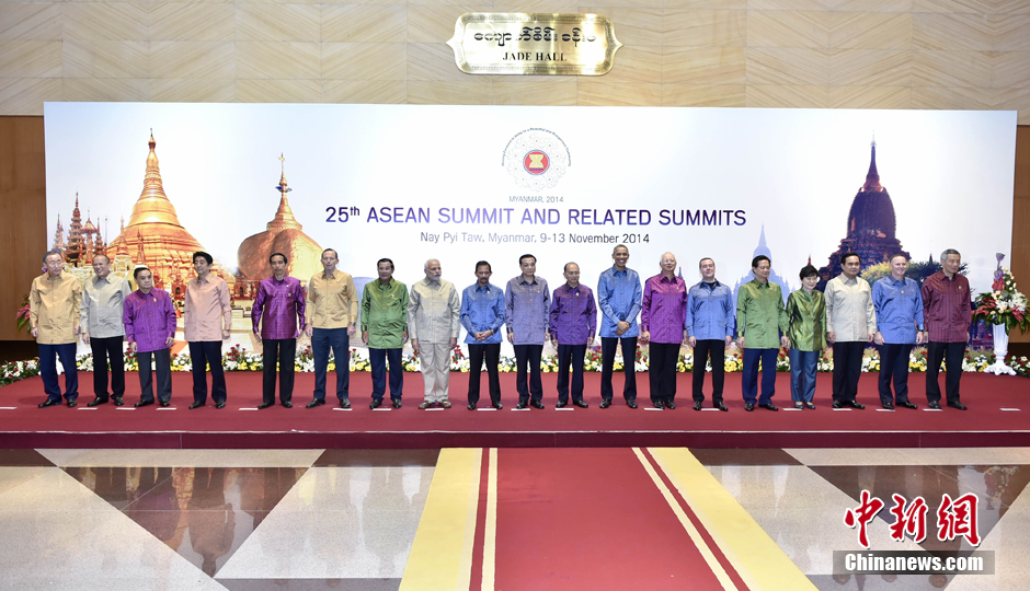 李克強総理は12日、ミャンマーの首都ネピドーでテイン?セイン大統(tǒng)領夫妻が東アジアサミットに出席する各國首脳のために催した歓迎夕食會に出席した。寫真は各國首脳の記念寫真。新華社が伝えた。(編集NA)