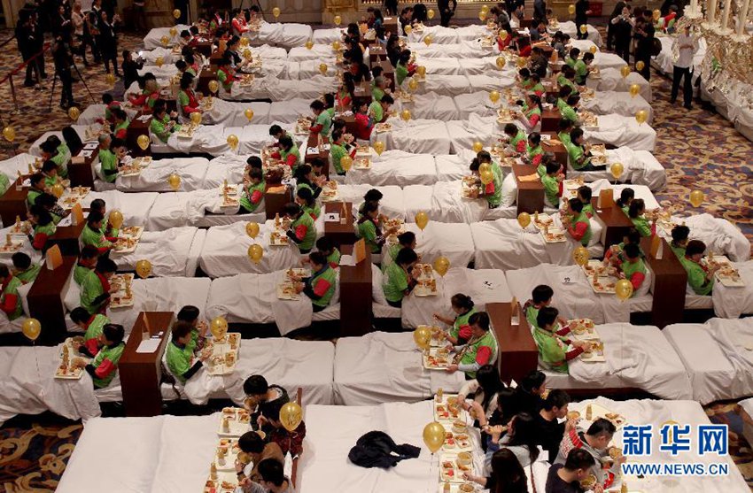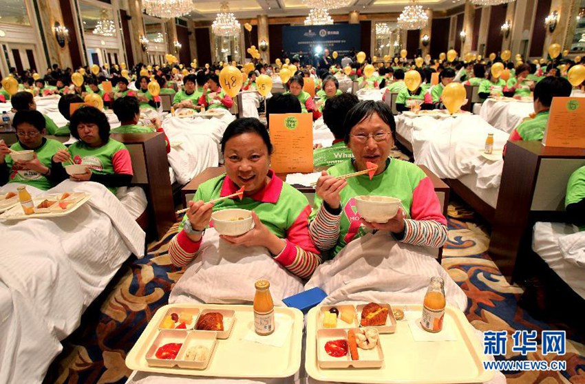 參加者388人が上海?浦東シャングリラホテルで12日、「最も多くの人がベッドで朝食」というギネス世界記録を更新した。ホテルの宴會大ホールに合計202床のベッドが置かれ、參加者はベッドのヘッドボードに寄りかかり、ベッドに足を投げ出して、トレイに置かれた食事を同時に味わった。新華網が伝えた。(編集YH)