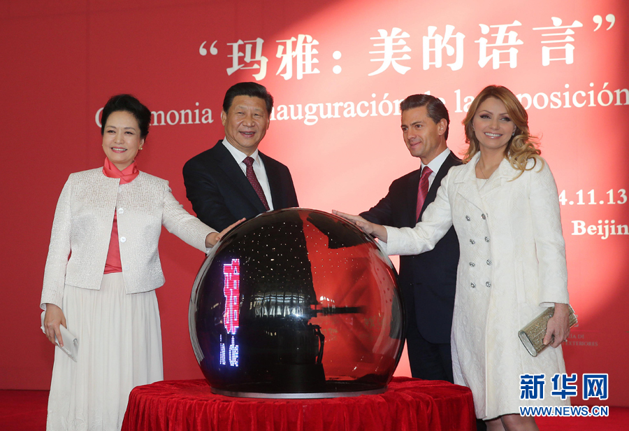 習近平國家主席は13日、メキシコのエンリケ?ペニャ?ニエト大統(tǒng)領(lǐng)とともに國家博物館で行われた文化展「マヤ:美の言葉」の開幕式に出席した。
