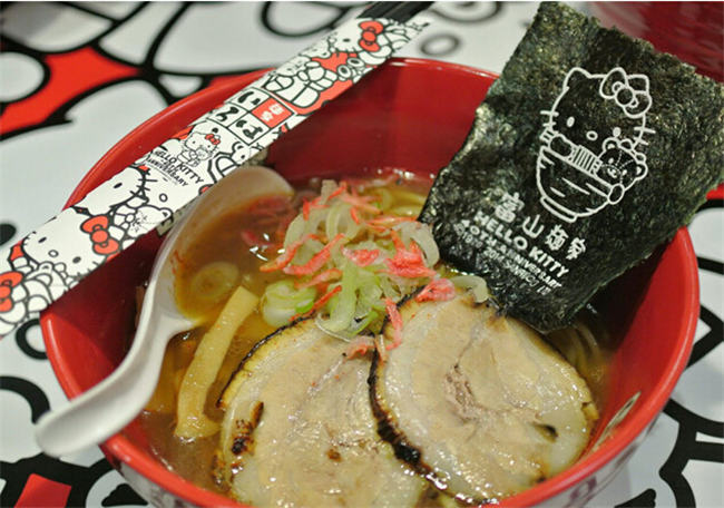 キティのテーマパークの他に、キティをテーマにしたレストランも人気を集めている。富山?麺家いろはは店は小さくとも、テレビ?xùn)|京が開(kāi)催する東京ラーメンショーで4年連続で優(yōu)勝し、2012年には5日で1萬(wàn)4645杯を販売して記録を更新した。同店の看板メニューは富山ブラックだ。キティの40周年を記念して、ハロー?キティが銅鑼灣の富山麺家に姿を見(jiàn)せ、數(shù)量限定版のラーメンや記念品が発売された。店內(nèi)は壁畫(huà)やポスター、テーブル、のぼり、食器まで全てハロー?キティだ。